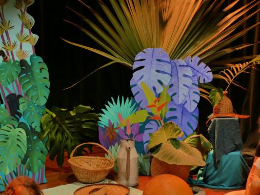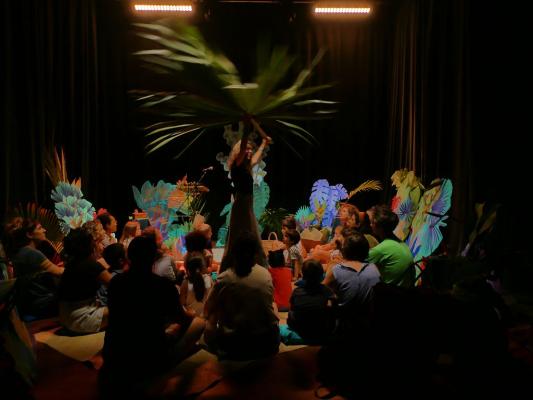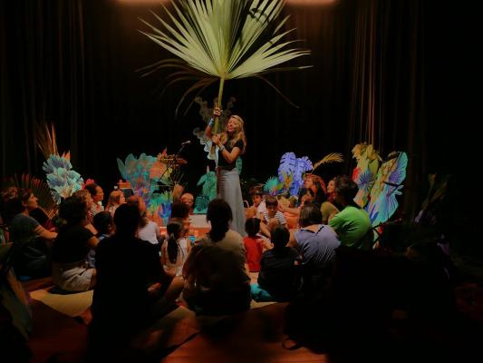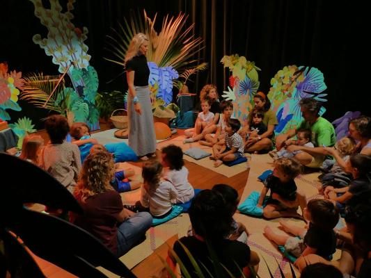 À leur arrivée, les enfants étaient invités à s'installer en demi-cercle, entourés de plantes luxuriantes et de fresques représentant une nature colorée, soigneusement réalisées par l’illustratrice Judith Gueyfier. Cet écrin de verdure et de couleurs créait un cadre propice à l'immersion dans le monde sensoriel proposé par Cécile Leroy.