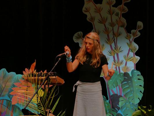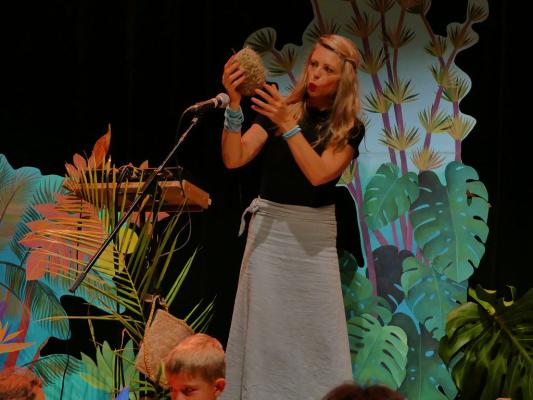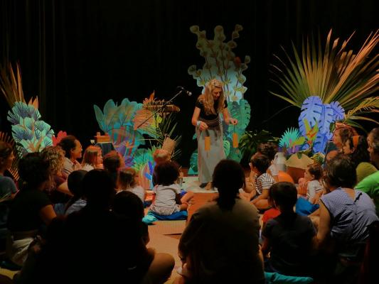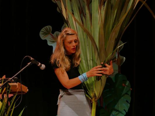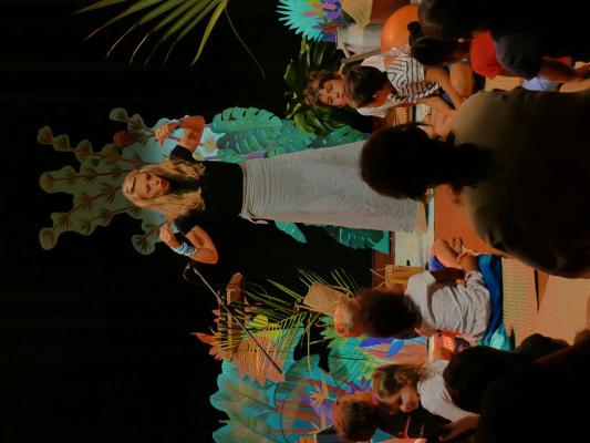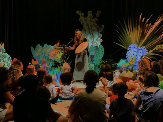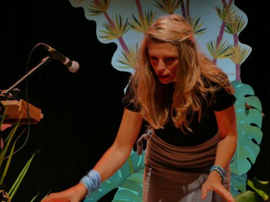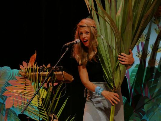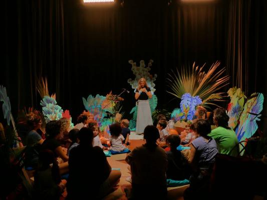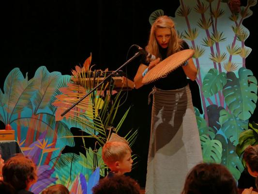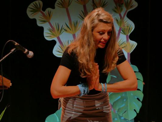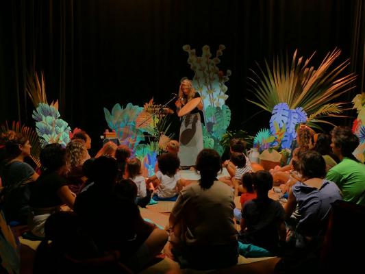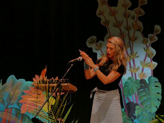 Seule sur scène, Cécile Leroy a captivé son jeune public en mêlant douceur et poésie. Elle chante, manipule délicatement des végétaux et façonne une bulle sonore où les petits bruits de la nature se fondent harmonieusement avec sa voix apaisante. Chaque geste est une invitation à la découverte, chaque note une caresse pour l'âme.